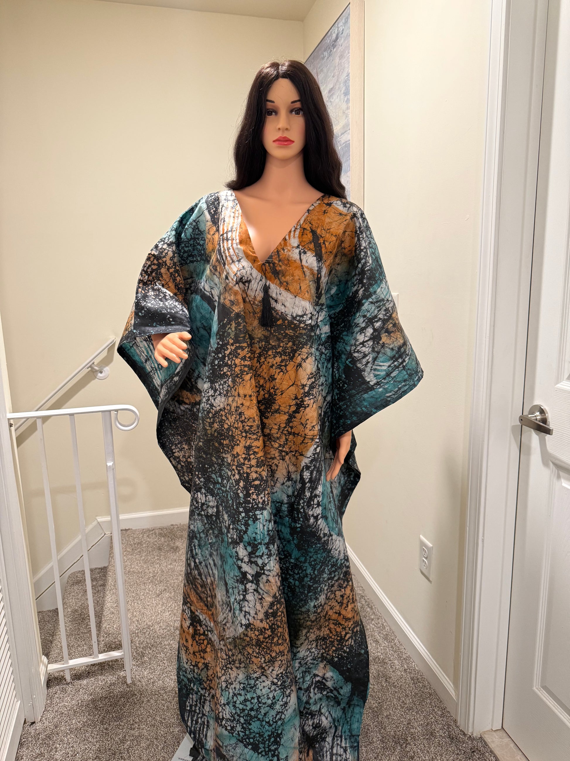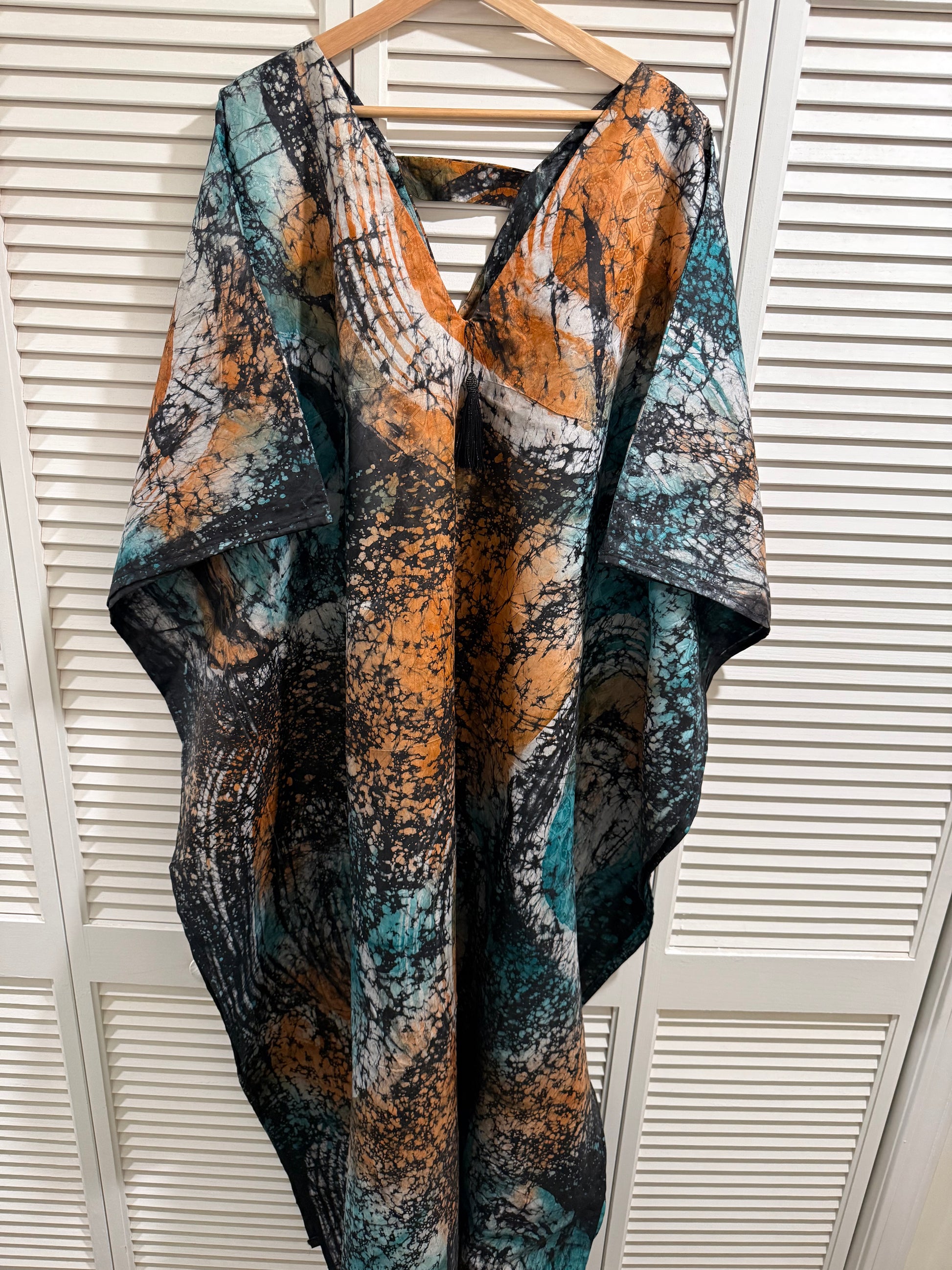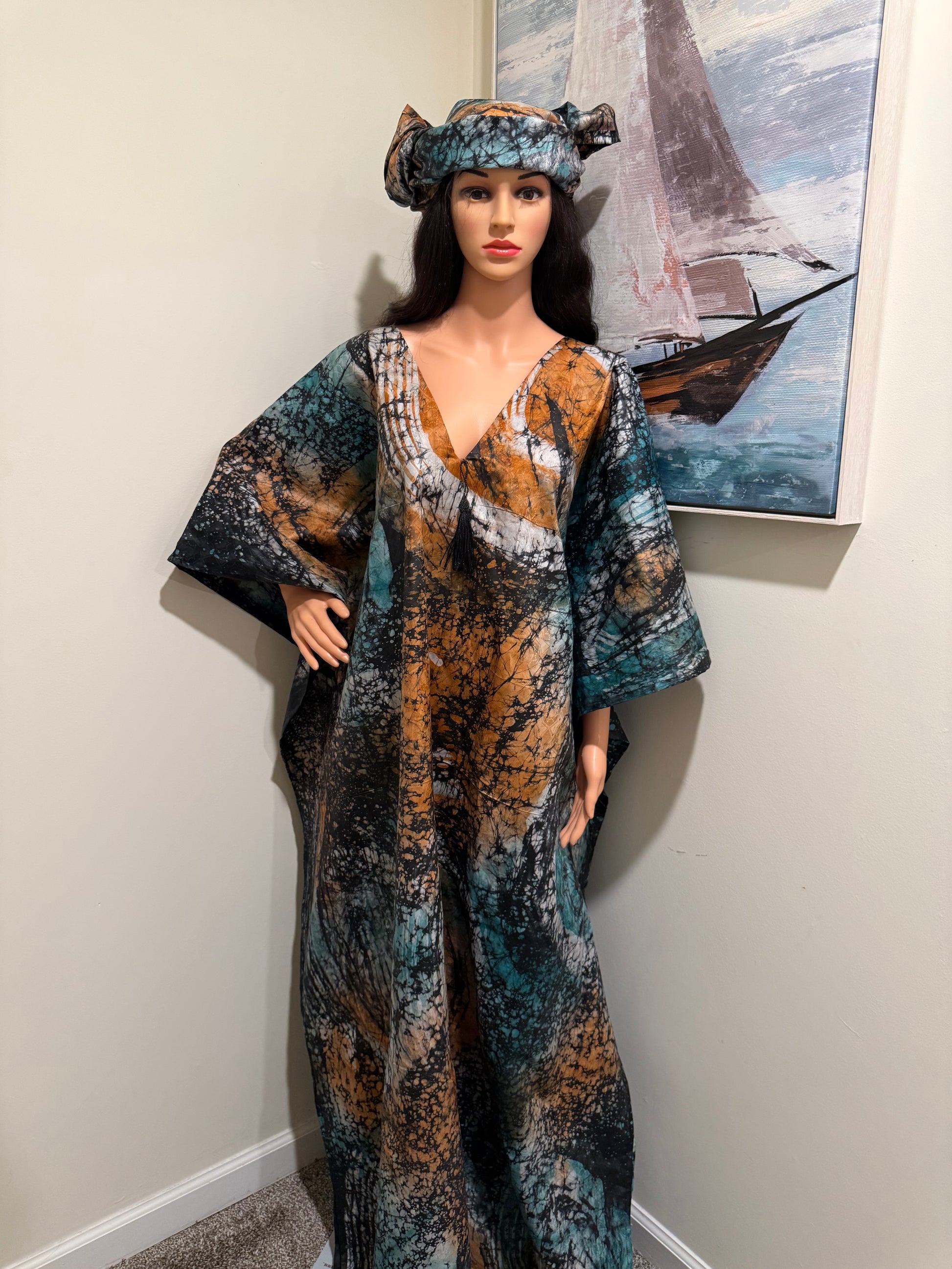 Step into Eid with elegance in this stunning Adire kaftan set, designed for comfort, modesty, and effortless style. Made from high quality Adire fabric, this piece features a beautiful abstract blend of teal, burnt orange, black, and earthy tones that make a bold yet refined statement.