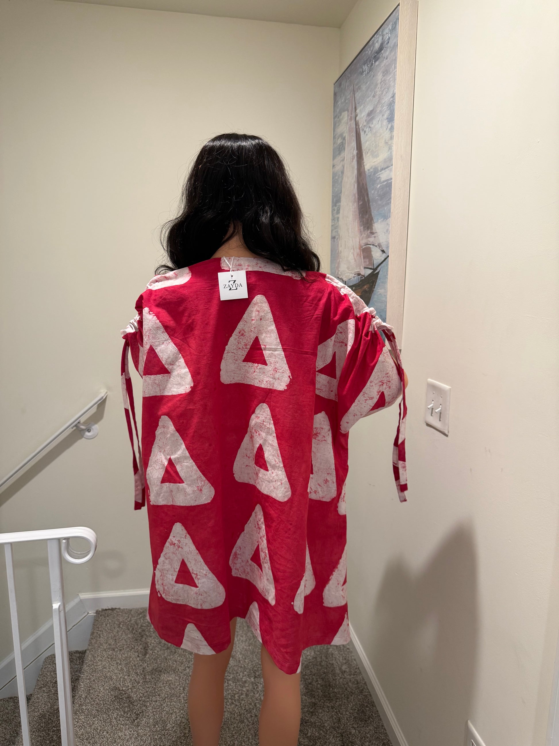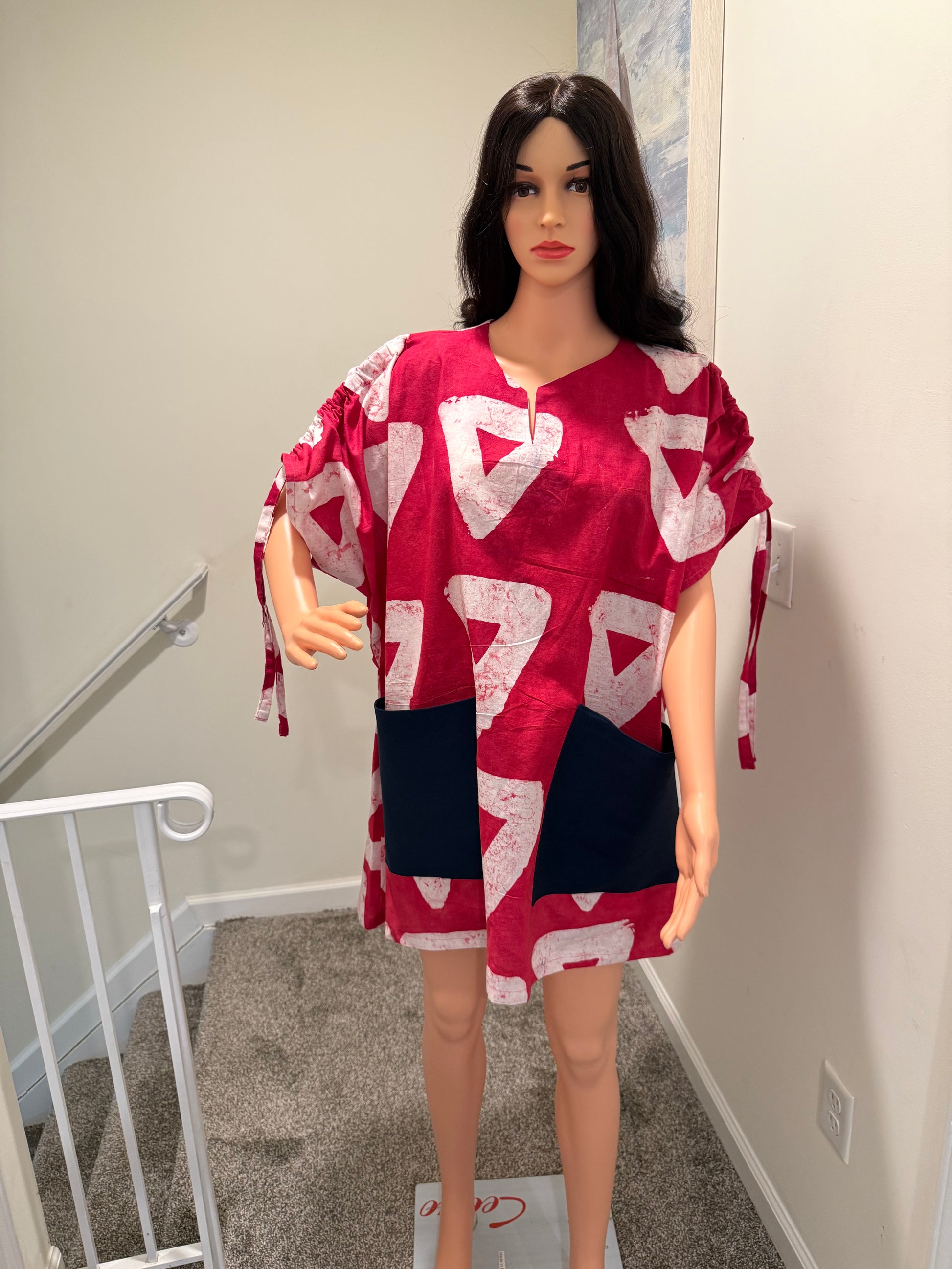 Make a bold summer statement with this vibrant pink mini dress made from breathable, hand-dyed Adire cotton. Featuring oversized white abstract triangle prints, this relaxed-fit dress is designed for comfort and effortless style. The elbow-length sleeves are finished with adjustable side ties, and the front boasts two large navy blue denim pockets — perfect for both style and function. Pair it with your favorite sandals for an easy, stylish look.