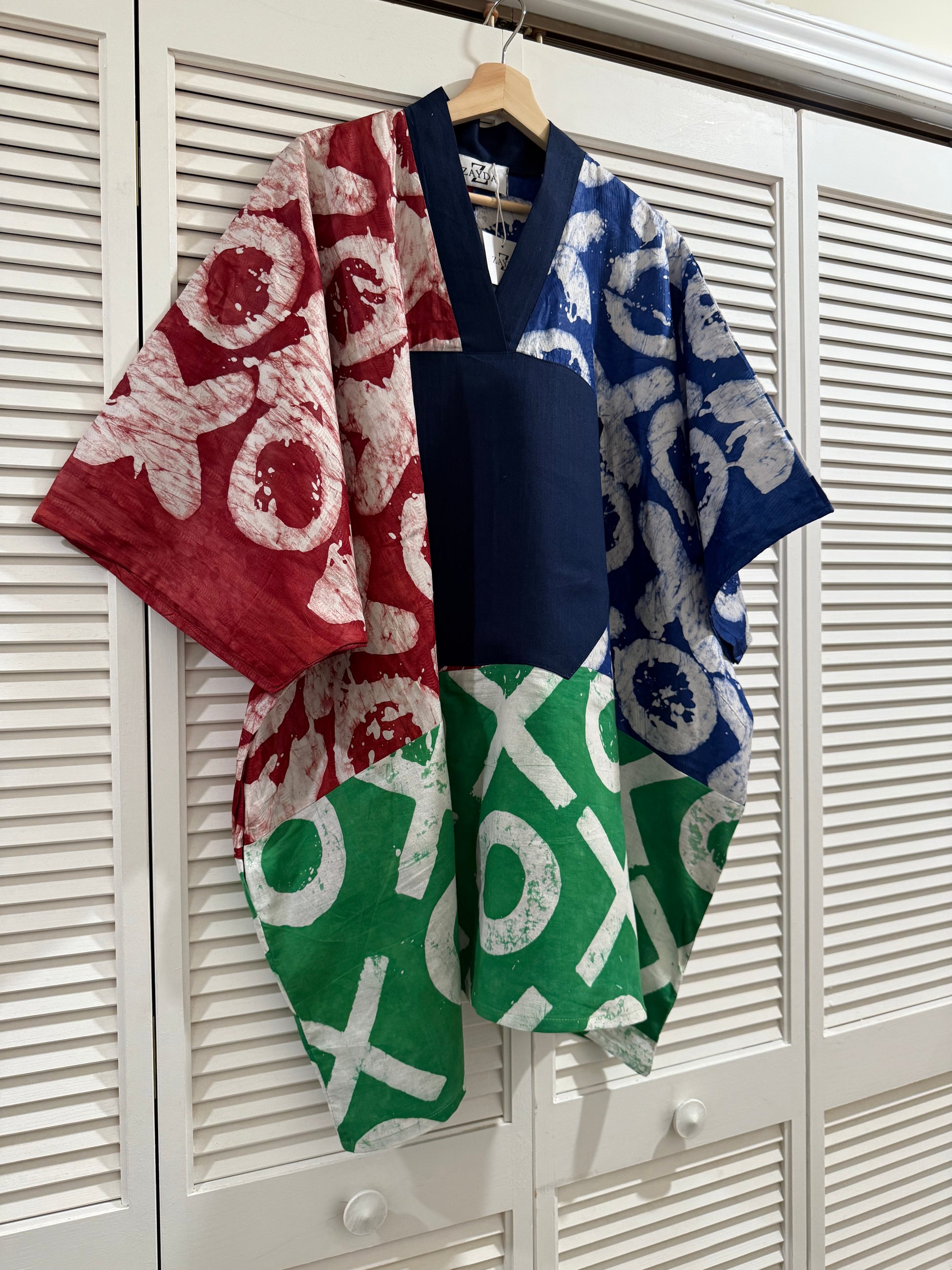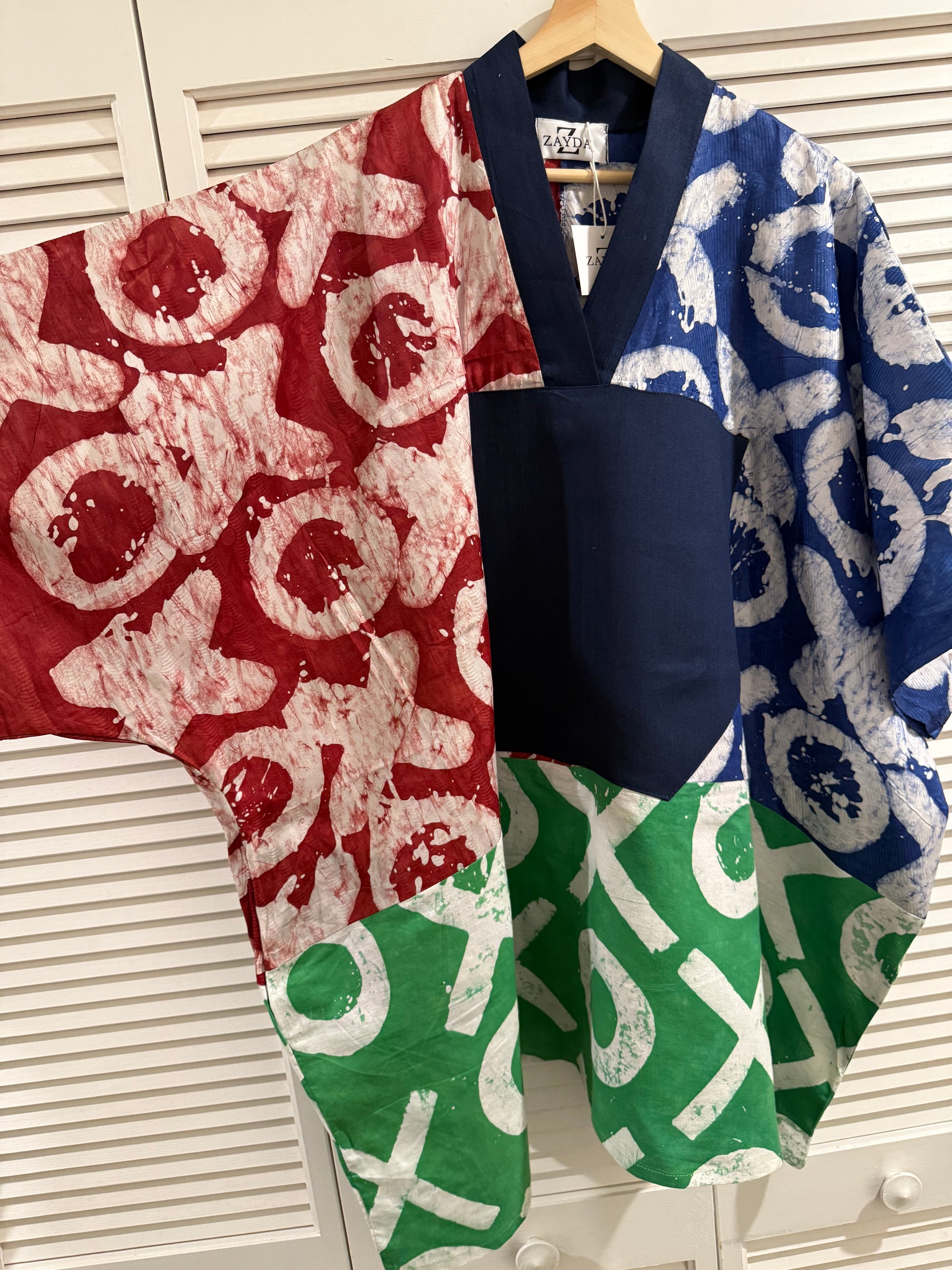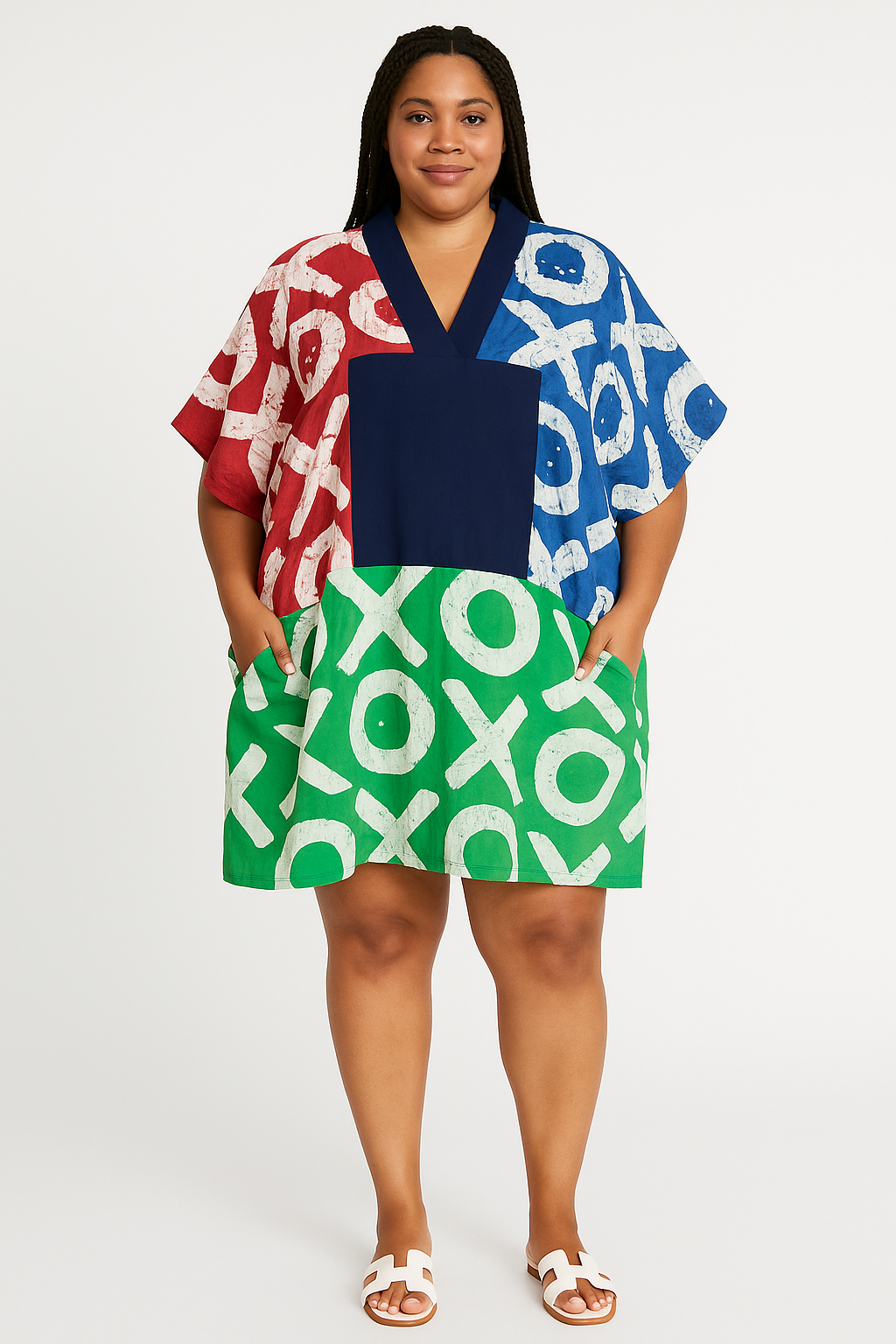 Make a bold statement in this vibrant, handcrafted Mini dress made from authentic hand-dyed adire fabric. Designed with a unique color-block X and O motif in maroon, blue, and green, this short dress features a structured denim neckline for a modern contrast.