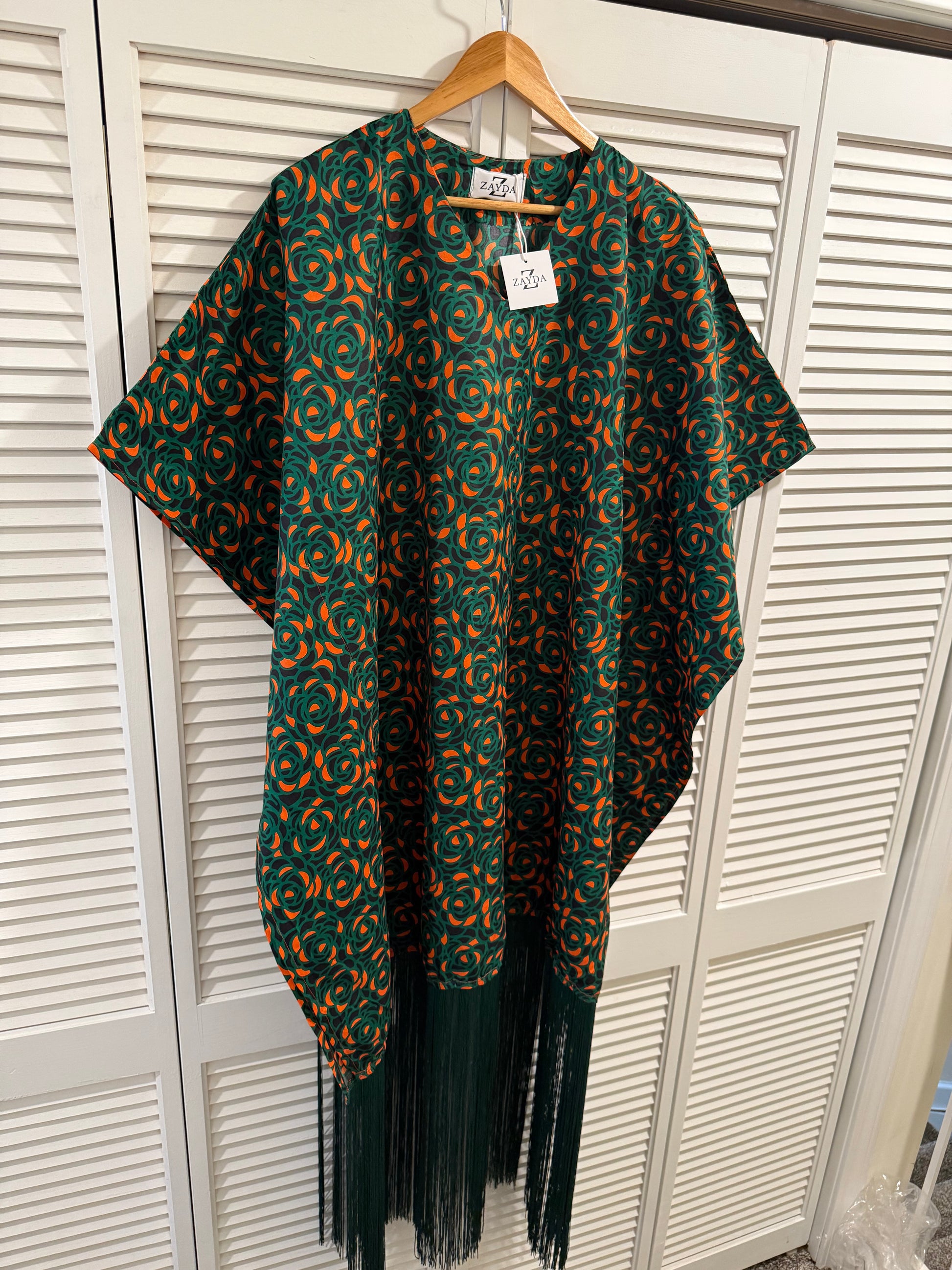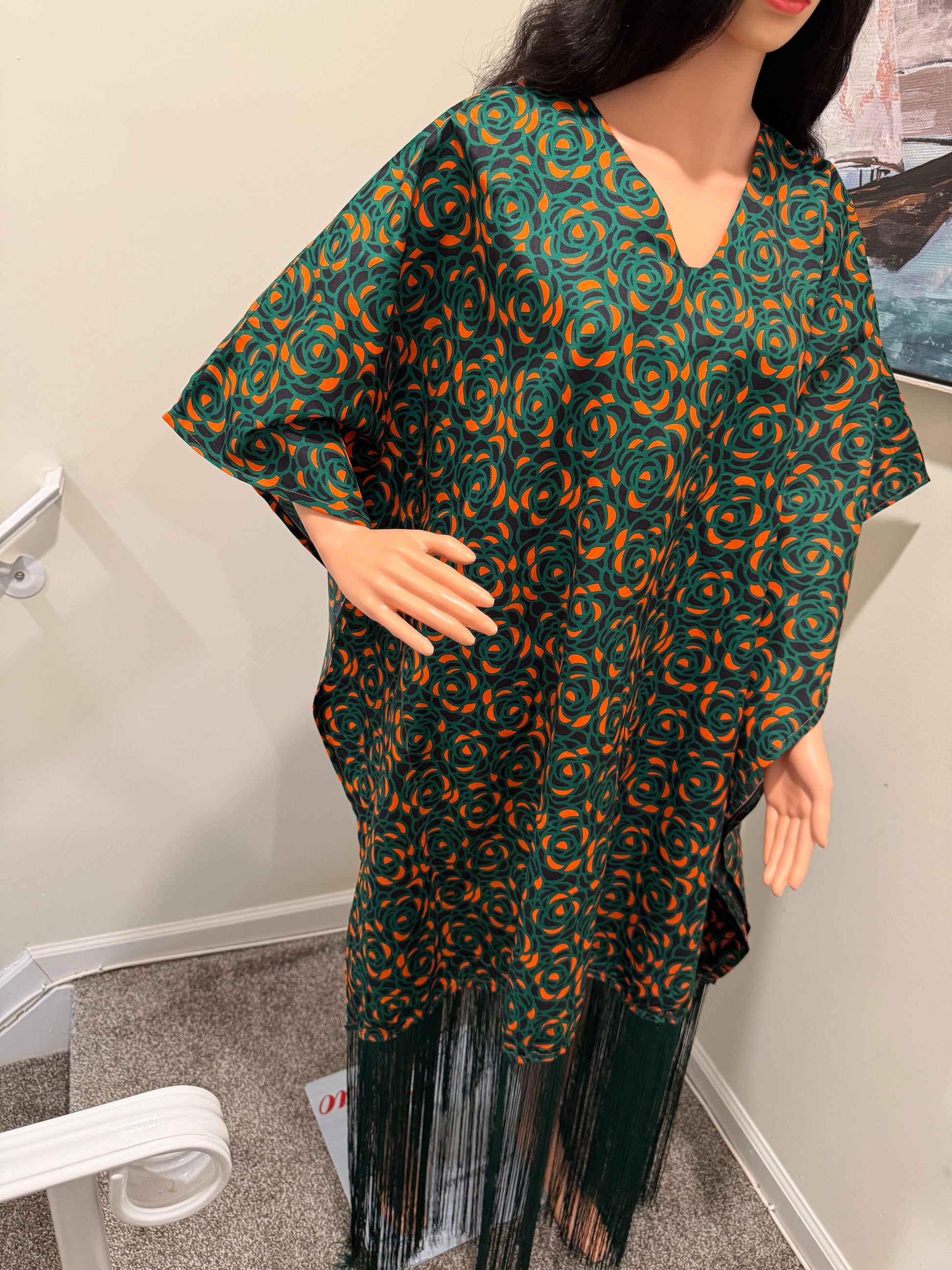 Turn heads effortlessly with this stunning Ankara fringe kaftan dress, perfect for both casual outings and special occasions. Crafted from vibrant Ankara fabric, this dress features a beautiful swirl pattern in rich green and orange tones. The loose-fitting, flowy silhouette ensures maximum comfort while offering a touch of elegance.