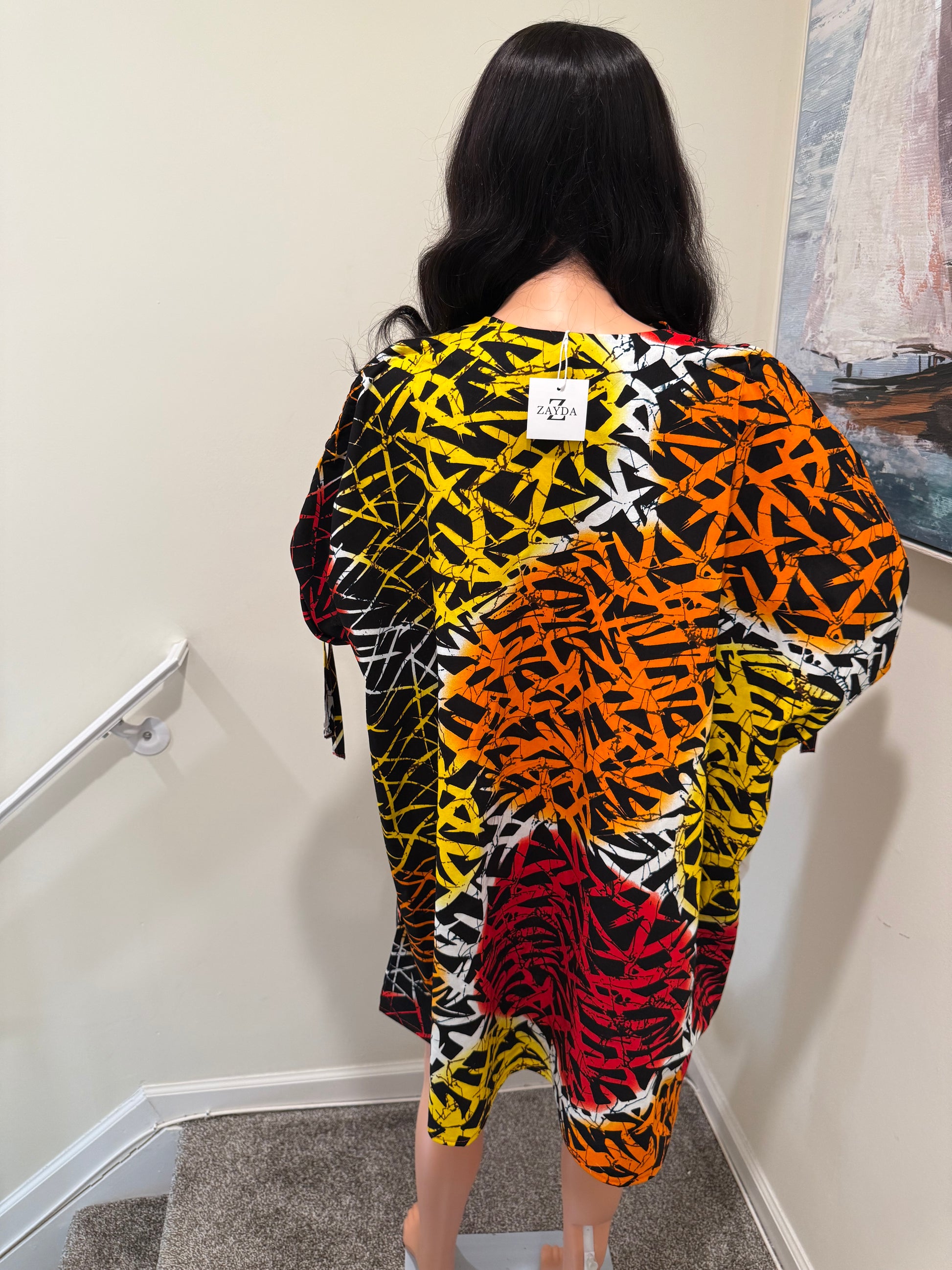 Turn heads effortlessly in this vibrant Ankara mini dress, crafted from 100% breathable cotton for all-day comfort. Featuring a colorful patchwork of red, yellow, orange, and black with striking abstract patterns, this dress brings energy and personality to any wardrobe.