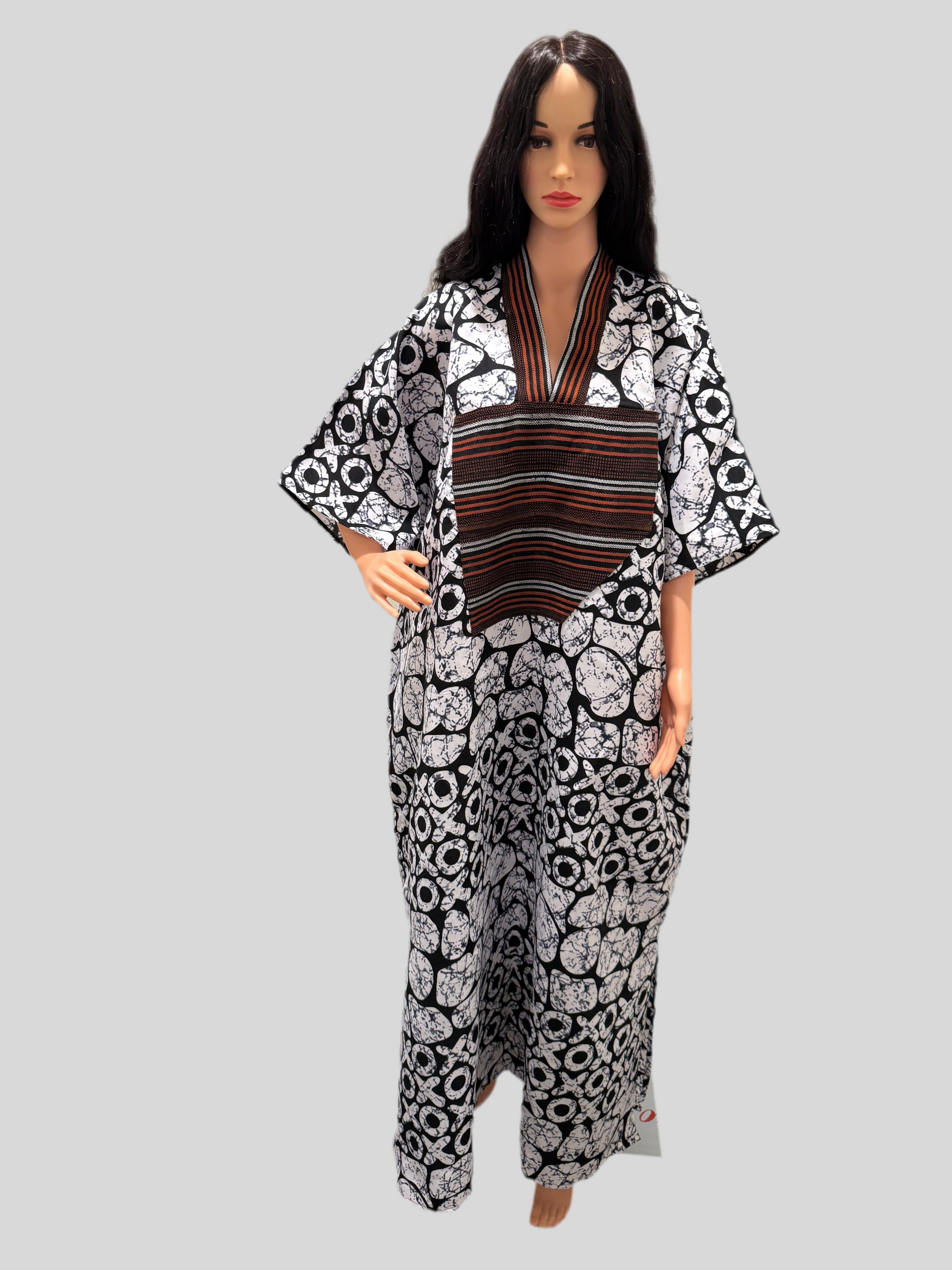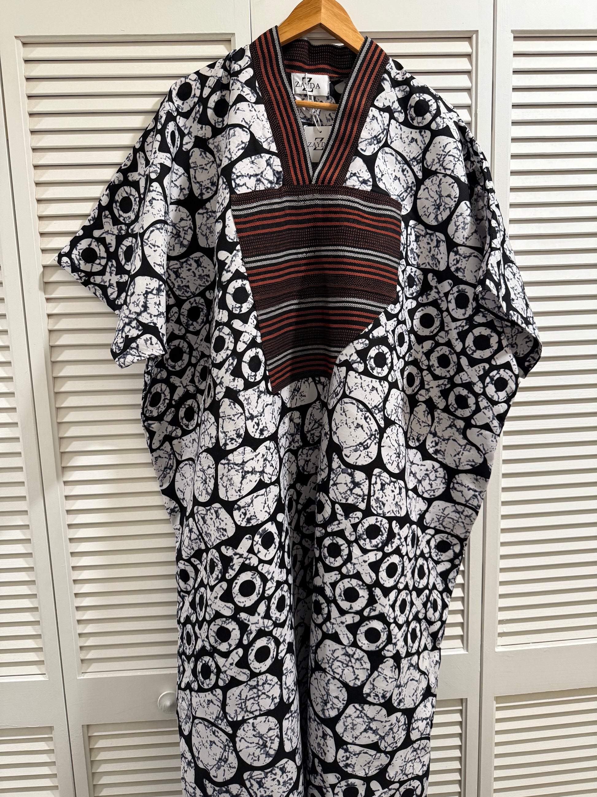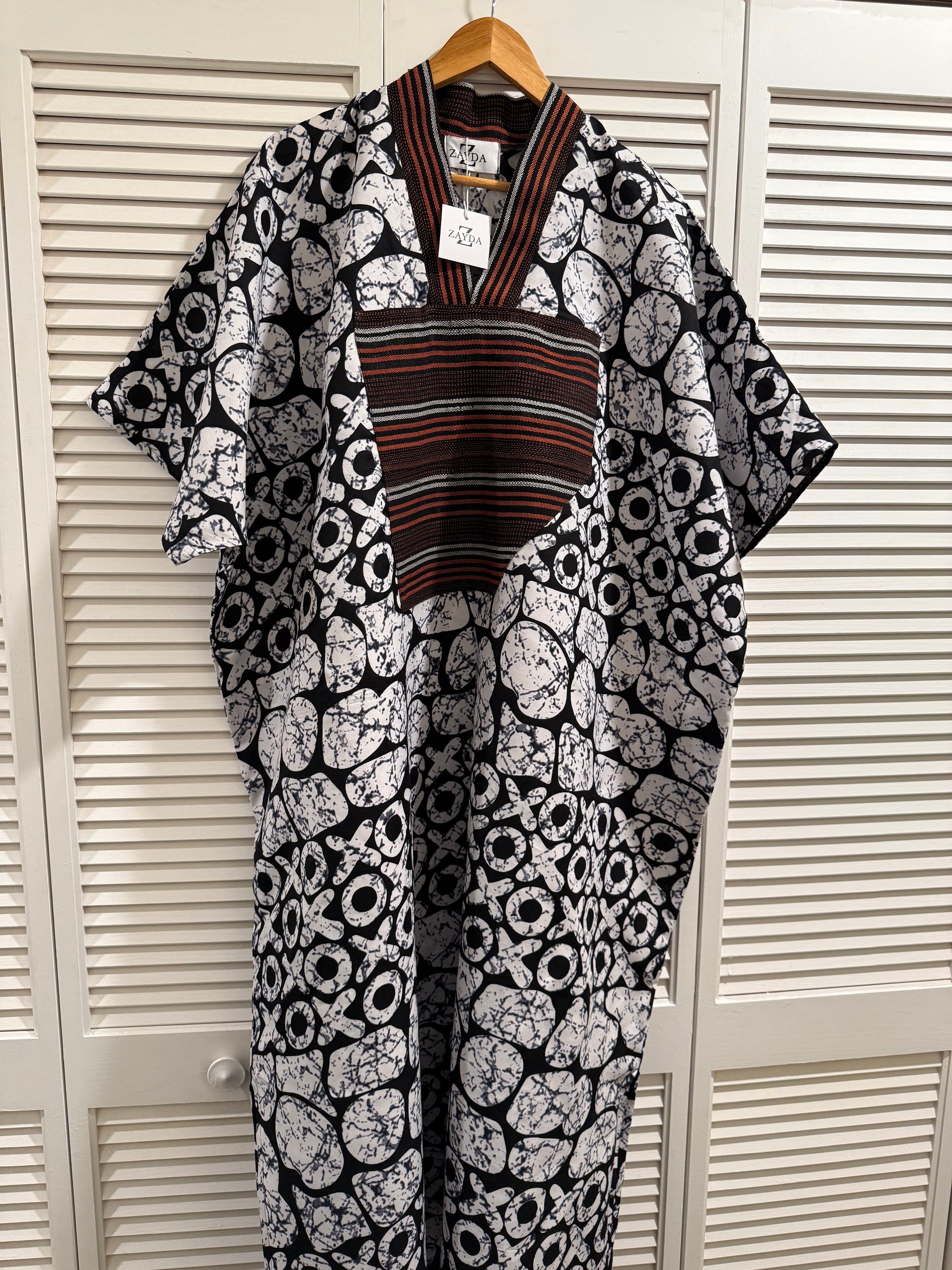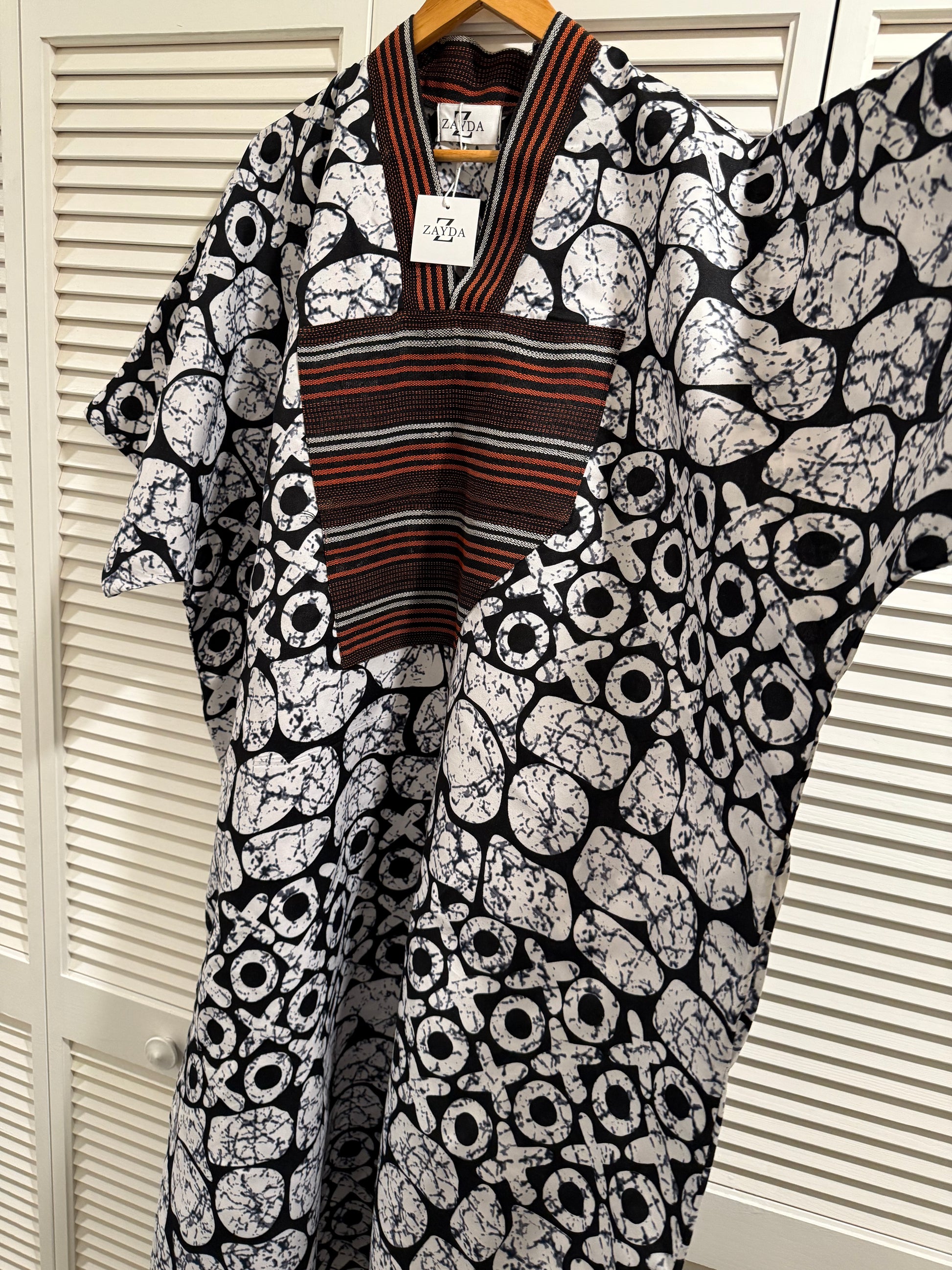 Effortlessly stylish and incredibly comfortable, this kaftan is made from soft, breathable cotton Ankara fabric featuring a bold black and white print. The highlight is the beautifully handwoven Aso Oke panel at the neckline — adding a rich, traditional touch to a modern silhouette.