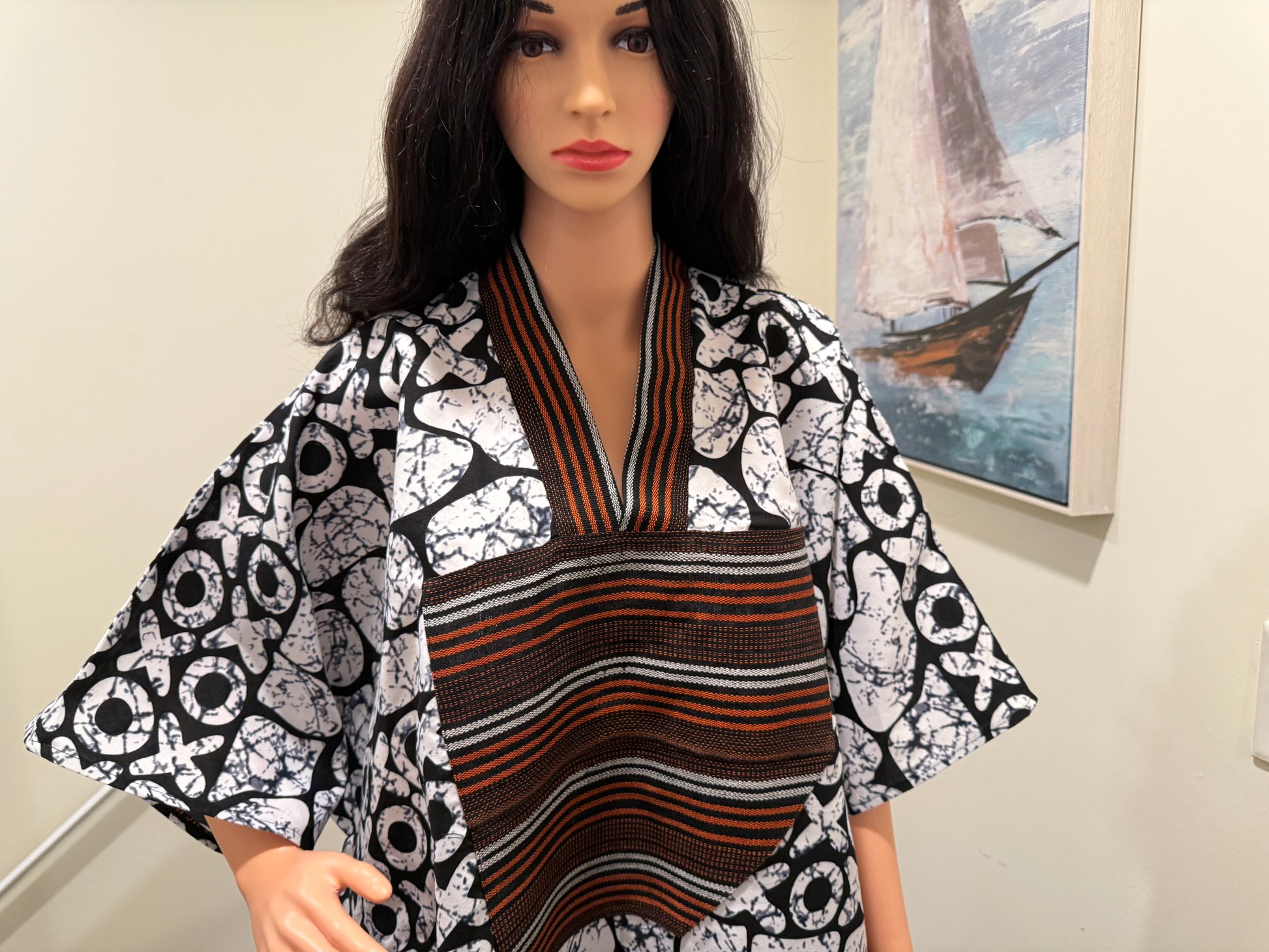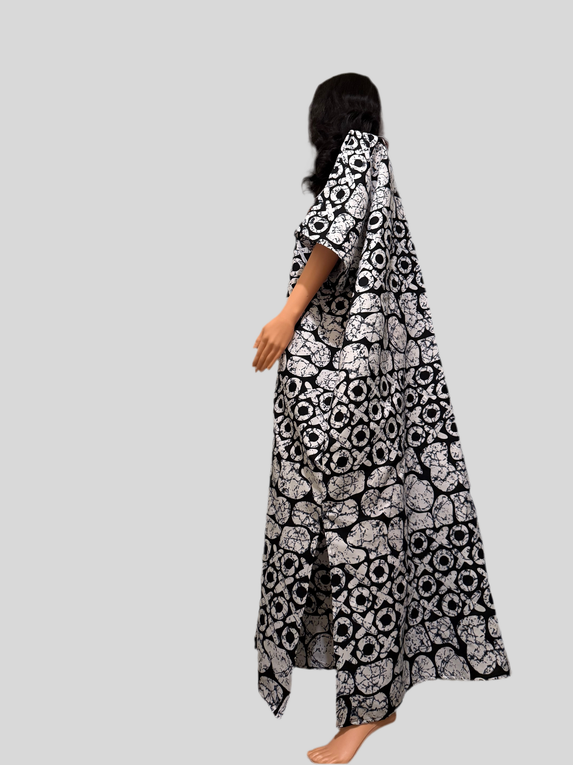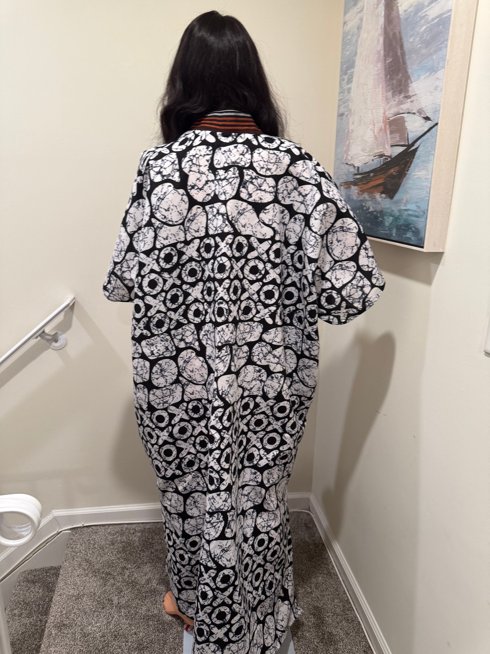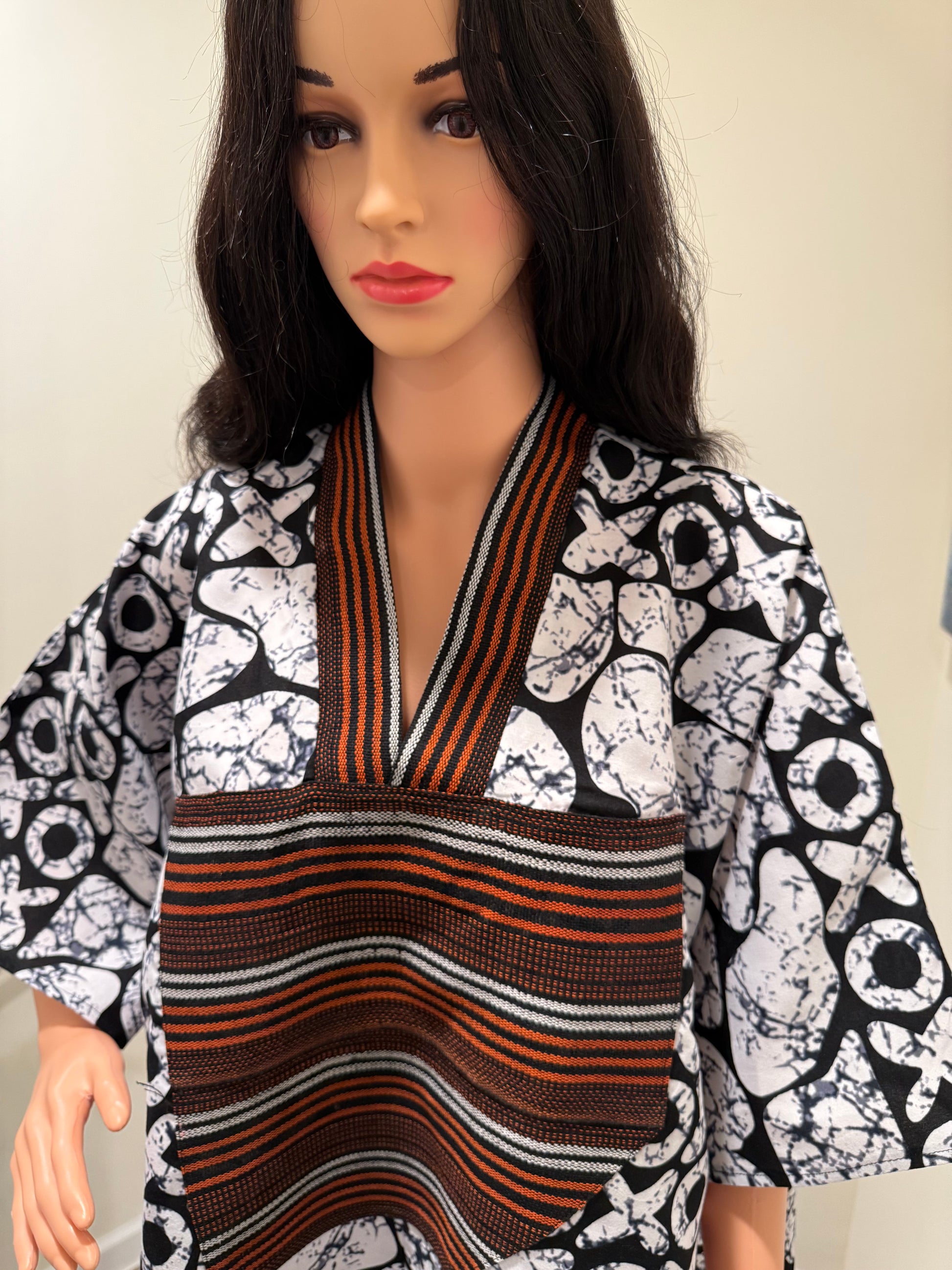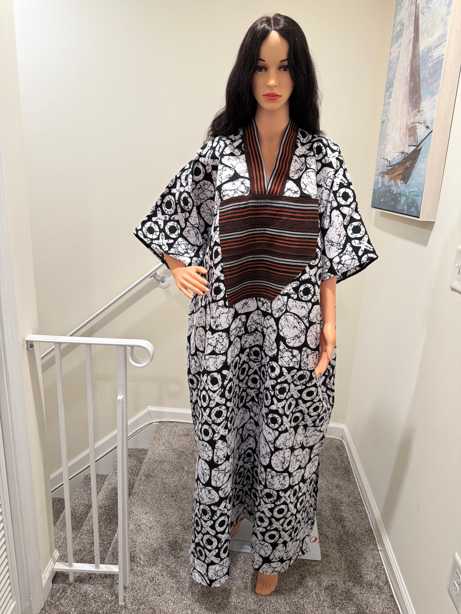 Effortlessly stylish and incredibly comfortable, this kaftan is made from soft, breathable cotton Ankara fabric featuring a bold black and white print. The highlight is the beautifully handwoven Aso Oke panel at the neckline — adding a rich, traditional touch to a modern silhouette.