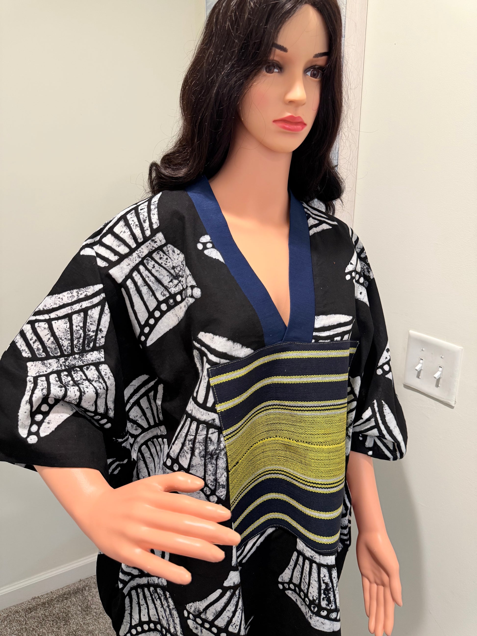 - Design: African talking drum print, mixed with authentic Aso Oke and denim neckline